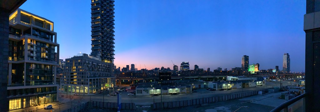 From the balcony the skies are expansive, the weather ever-shifting. We are at the very bottom of the city looking north into it, watching….
