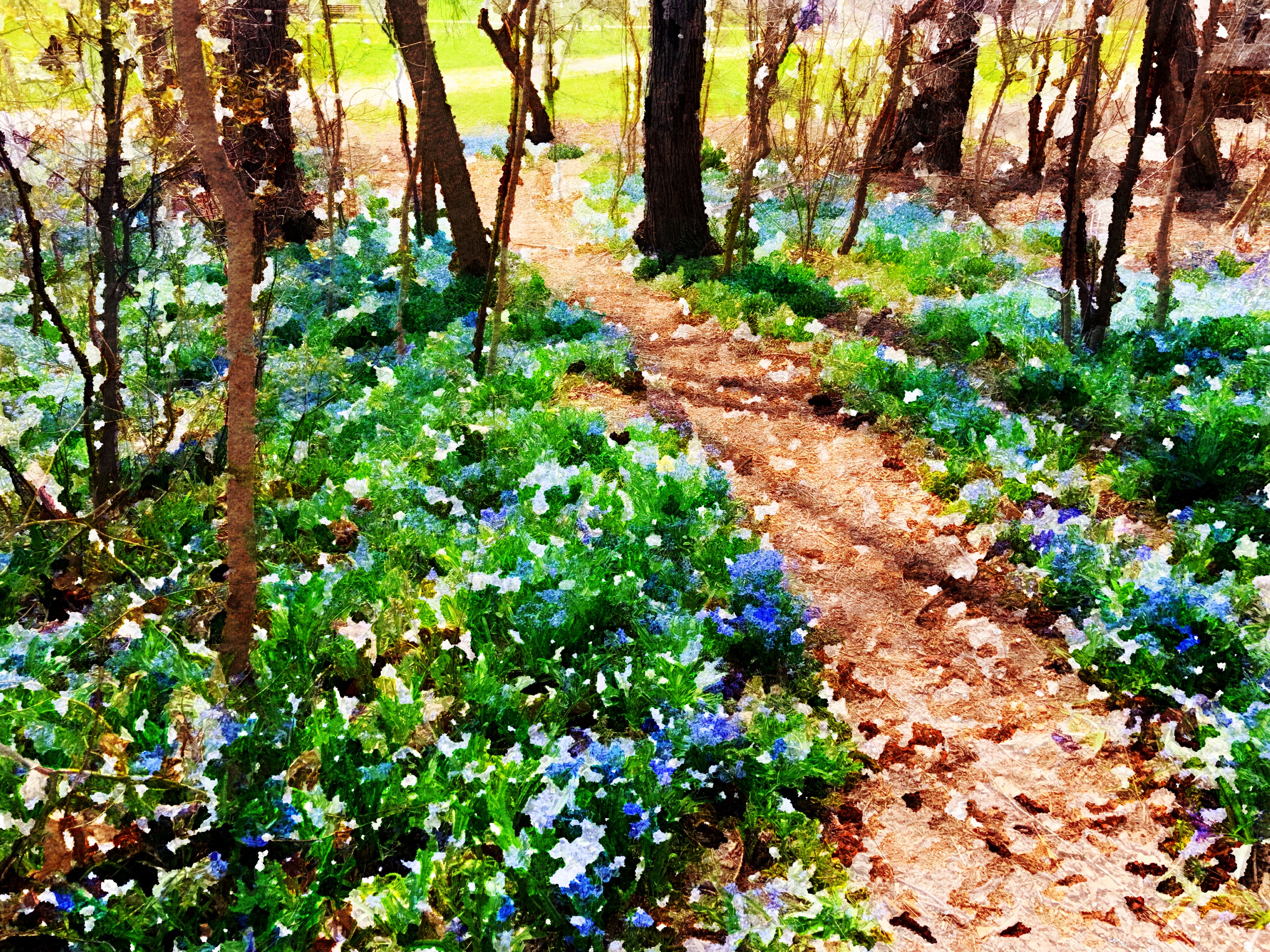 Many blocks further up into Little Italy on such a beautiful sunny day and we sat in the park for what seemed like days, catching up on so many things, but here and there remembering that beautiful question, until it was time to pee so we headed out through a little pathway that had been beaten out amongst some trees and oooo’d and aaaa’d over the little fields of bluebells giving a colourful shape to the path.