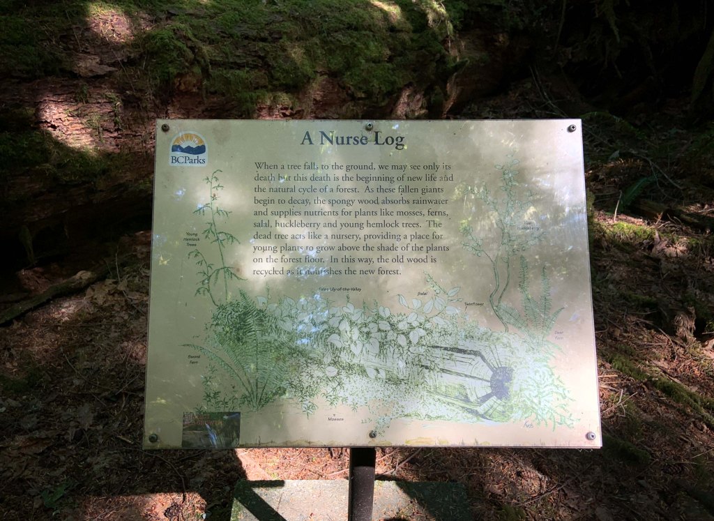Later in the summer I was out in BC where nature is just off the charts, and we were in this place called Cathedral Grove, where they helpfully point out for you things like “nurse logs”.